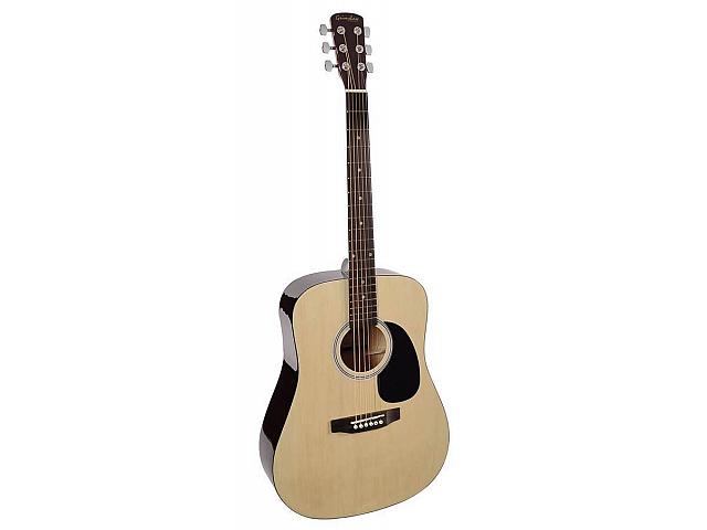 Тип деки: дредноут; Верхняя дека: ламинат ели; Нижняя дека и обечайка: американская липа; Бридж: палисандр; Механика: литая; Седло бриджа: пластиковое, компенсированное; Верхний порожек: пластиковый; Лады: посеребренный никель; Мензура: 645мм; Верхний порожек: 42мм; На 12 ладу: 54мм; 1 пуговица для ремня; Цвет: натуральный.