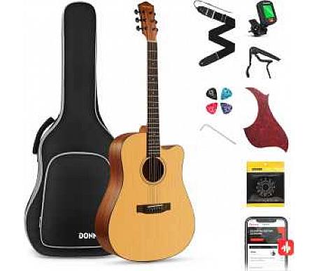 Полноразмерный 41-дюймовый корпус дредноута для полного и яркого звучания, 6 прочных и надежных стальных струн, этот гитарный комплект подходит для всех стилей музыки: идеальные низкие частоты, насыщенные средние частоты.