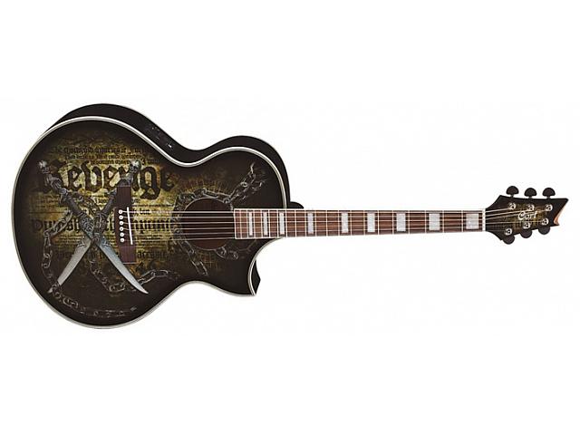 акустическая гитара с датчиком и графикой "Warrior Souls", верхняя дека из цельной ели, нижняя дека и обечайка из красного дерева, гриф из красного дерева с накладкой из палисандра, вырез, декорированная накладка грифа, окантовка корпуса, темброблок CE304T (с тюнером), струны D'Addario EXP16, цвет черный