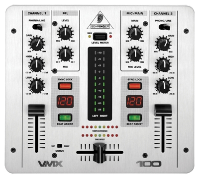 Behringer Pro Mixer VMX100 – это небольшой двухканальный пульт, имеющий автоматический счетчик BPM с индикаторами синхронизации темпа (Tempo Difference) и временной задержки (Time Offset), функции Sync Lock (упрощает задачу подсчета BPM) и Beat Assist (темп задается с помощью кнопки), оснащен также микрофонным входом с регулятором и двухполосным эквалайзером на каждый канал. Кроссфейдер ULTRAGLIDE, разрекламированный в проспектах как «сверхплавный», оборудован переключателем характеристики огибающей ("плавно" или "резко").