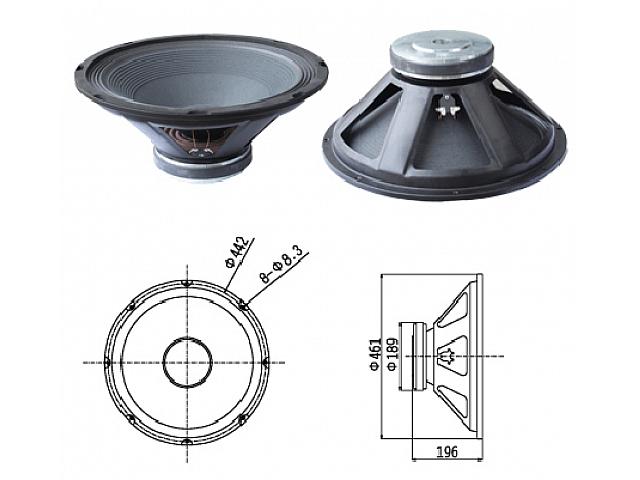 динамики для акустических систем, 18", диапазон частот 0.03-2.5 кГц, звуковое давление 96 Дб, сопротивление 8 Ом, мощность 400 Вт