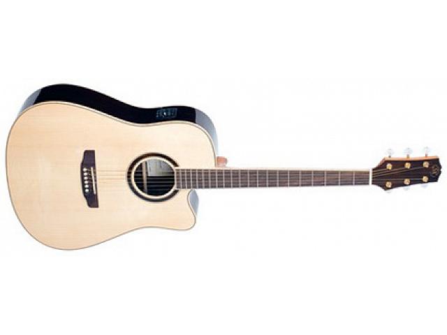 акустическая гитара, верхняя дека - цельная ель, гриф - красное дерево, колки Die-Cast, золотое покрытие