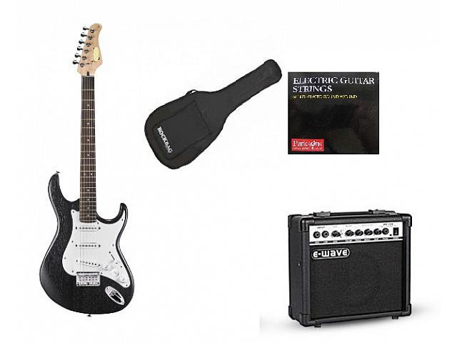 Комплект состоит из электрогитары, струн для электрогитары, комбоусилителя для электрогитары и чехла