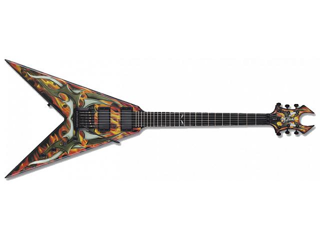 электрогитара, модель Kerry King Speed V G2 Flame, 6 струн, корпус красное дерево, гриф клён, привинченный, датчики H-H, темброблок - 2 х громкость, тембр, 3-х позиционный переключатель, 24 лада, мензура 648 мм, механика черная, цвет огненный, с графикой
