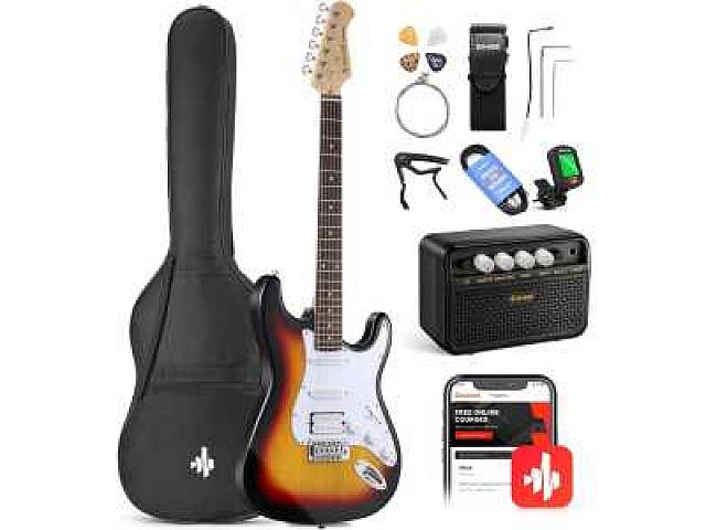 В комплект входит электрогитара Donner DST-1S, усилитель MINI мощностью 3 Вт, качественный чехол для концерта, гитарный каподастр, тюнер DT-2, струны, ремень и медиаторы. DST-1S имеет крепкий корпус из липы с тонкими арками, хромированные клавиши тюнера, высококачественные латунные струны и защитную накладку из ПВХ. Кольца для настройки изготовлены из стали для легкой настройки и удержания настроенной струны в нужном положении.