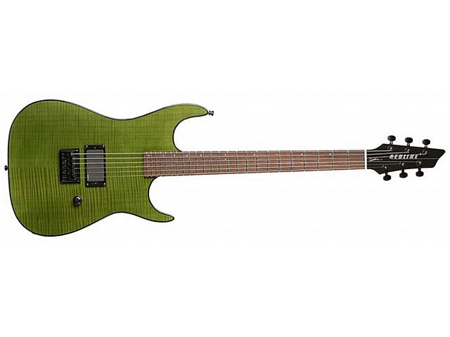 электрогитара, серия Redline, корпус - сребролистный клен с тополем по бокам, гриф - твердый клен, 24 лада, мензура 24 3/4″, бридж hardtail, звукосниматели - активный хамбакер EMG-81 (у бриджа), регуляторы - громкость, цвет Trans Green Flame, чехол в комплекте
