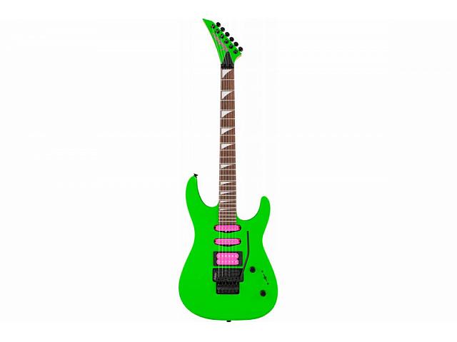 Захватывающая, как акустично, так и визуально, электрогитара JACKSON X SERIES DINKY DK3XR HSS NEON GREEN окрашена в цвет Neon Green и имеет реверсную заостренную голову грифа Jackson 6-в-ряд того же цвета с розовым логотипом «Jackson», черную фурнитуру и розовые катушки звукоснимателей.