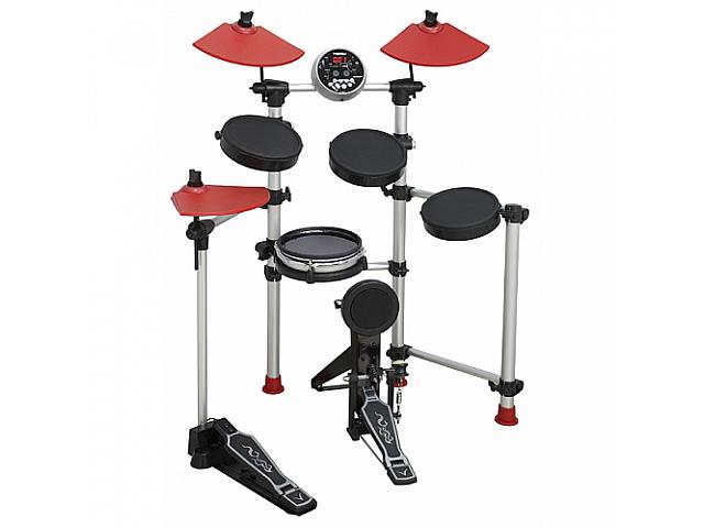 электронная ударная установка, 3 тома, 2 тарелки, малый барабан, хай-хет, педаль для хай-хета, пэд бас-барабана, 108 тембров, 10+5 пользовательских установок, 40 песен