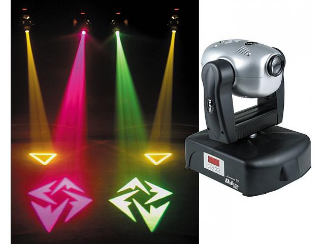 вращающаяся голова, 7 цветов + белый, 10 гобо + спот, строб каждого цвета, высокая скорость вращения без дежурных перемещений, активация звуком + 6 каналов DMX