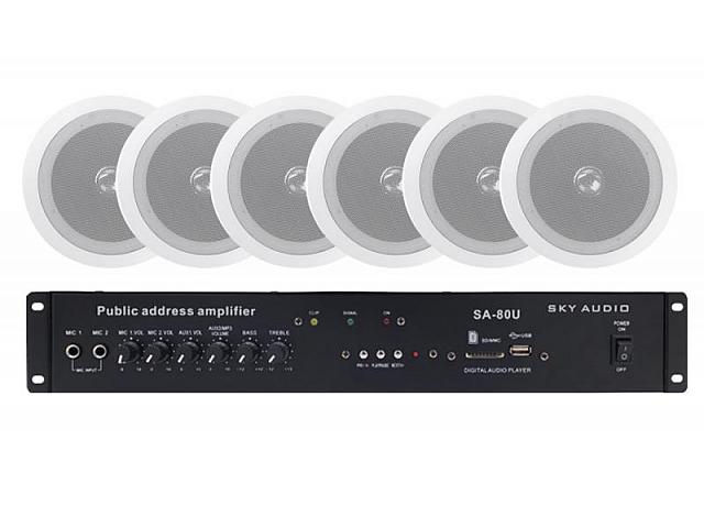 Акустический комплект SKY SOUND CS-1106 состоит из 6-ти потолочных динамиков Sky Sound NJ-11 и одного усилителя мощности Sky Sound SA-80U. Комплект данного оборудования предназначен для озвучивания небольших помещений, кафе, салонов красоты или офисов и т.д. (до кв 80.м.).