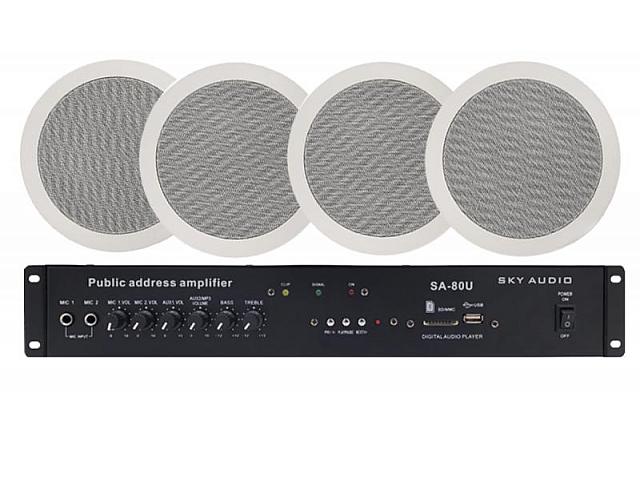 Акустический комплект SKY SOUND CS-3004 состоит из 4-х потолочных динамиков Sky Sound TS-2630T и одного усилителя мощности Sky Sound SA-80U. Комплект звукового оборудования предназначен для озвучивания небольших помещений, кафе, салонов красоты или офисов и т.д. (до 40 кв.м.)