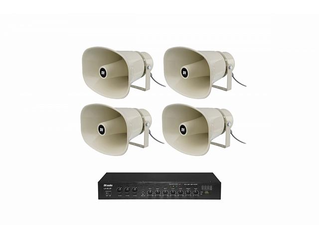 Комплект предназначен для фонового озвучивания открытых площадок, спортивных сооружений, рыночных площадей, парков, а так же озвучивания промышленных объектов площадью до 1200м².