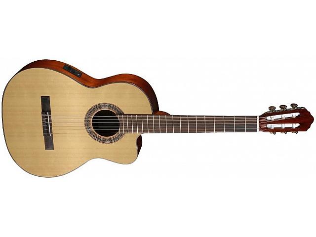 классическая гитара с вырезом, верхняя дека из ели, нижняя дека и обечайка из палисандра, вырез, гриф из красного дерева, темброблок, пъезозвукосниматель, цвет натуральный