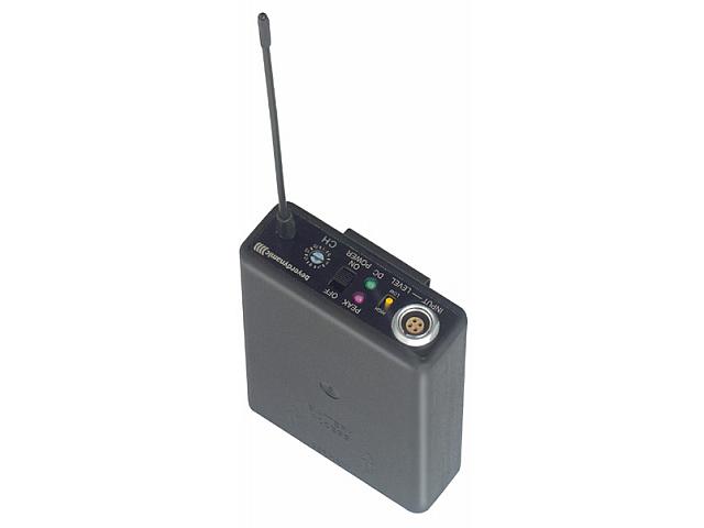 Для подключения петличного или головного микрофона. 863-865 МГц. 16 переключаемых частот. Внутренняя антенна. Аккумулятор 9 В, 270 мA-ч.