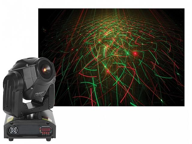 вращающаяся голова, 2 лазера (красный 80мВт, зеленый 30мВт), эффект "космического пространства", более 500 красных и зеленых лазерных лучей, режимы: Master/Slave, DMX-управление