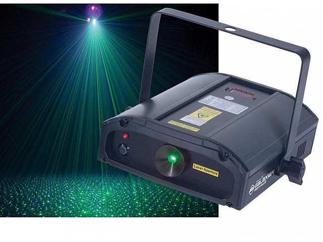 лазерный светоприбор, 2 лазера (красный 80мВт, зеленый 30мВт), эффект "космического пространства", более 500 красных и зеленых лазерных лучей, режимы: Master/Slave, DMX-управление