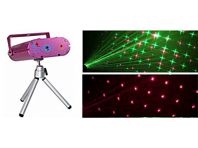 компактный мини-лазер типа Meteor, зеленый+красный, 25мВт+80мВт, звуковая активация, автоматические программы, металлический корпус, питание от адаптера