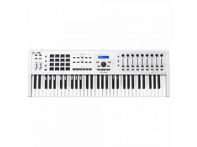 Arturia KeyLab 61 MkII является универсальным MIDI-контроллером, который включает в себя 61 чувствительных к скорости клавиш с послекасанием, кликабельный энкодер, 9 дополнительных энкодеров, 9 слайдеров, 16 с RGB подсветкой сенсорных и чувствительных к давлению пэдов, 6 переключателей управления, 4 командных переключателя, колесо модуляции и колесо pich-bend.