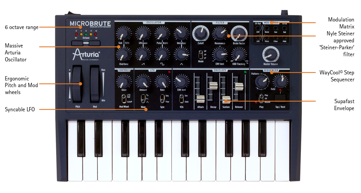 Если вы новичок в синтезаторах, то обратите внимание – перед вами один из самых простых в использовании и доступных приборов с уникальным звуком. А если вы — ветеран синтезаторных битв, то мы полагаем, от вашего внимания не ускользнуло, что MicroBrute – это очень серьезный, оснащенный секвенсором полумодульный зверь. Вам просто осталось услышать, как он звучит.