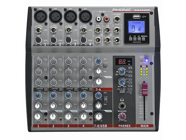 Аналоговый микшерный пульт Phonic AM 440 DP профессиональной серии AM со встроенным цифровым процессором эффектов и встроенным USB проигрывателем.
