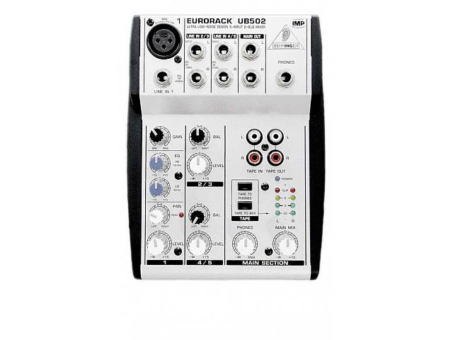 Микшерный пульт Behringer Eurorack UB 502 имеет один монофонический канал и два стерео. Моноканал имеет микрофонный вход (XLR, без фантомного питания), линейный вход (симметричный, джек), регулятор чувствительности, двухполосный эквалайзер, светодиодный пиковый индикатор, регуляторы уровня и панорамы. Каждый стереоканал имеет два линейных входа (симметричные, джеки), регуляторы уровня и баланса. Есть пара основных линейных выходов (несимметричные, джеки) с регулятором уровня, выход для наушников (джек) с регулятором уровня, два входа и два выхода для двухдорожечных устройств (RCA), два четырехсегментных светодиодных индикатора уровня, а также кнопки назначения входов для двухдорожечных устройств на основные выходы и выходы для наушников. Питание осуществляется от прилагаемого адаптера.