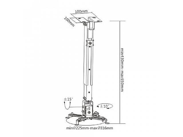 крепление для проектора, имеет хорошую и простую монтажную регулировку, обеспечивающую легкий монтаж, и жесткую фиксацию проектора на кронштейне. Кронштейн CHARMOUNT позволит надежно закрепить ваш проектор. Он разработан с учетом безопасности, максимальной функциональности, а также обладает эстетическим внешним видом и лёгкостью в установке. Расстояние от потолка 650мм1000мм. Наклон: -15°~+15°. Погрузка: до 10 кг