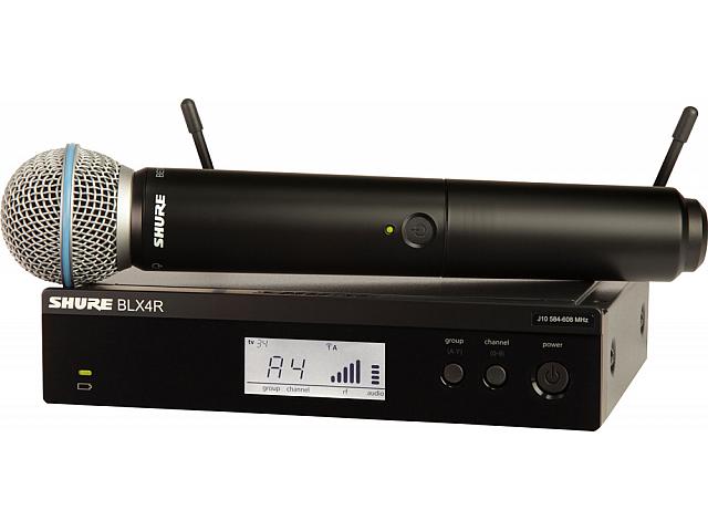 радиосистема: одноканальный рэковый приемник BLX4R, ручной передатчик BLX2/B58, блок питания, батарейки, микрофонный держатель, чехол на молнии, инструкция