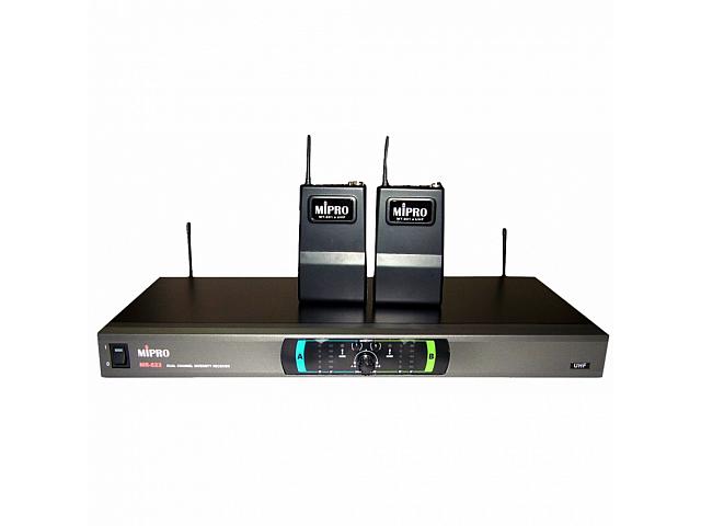 MIPRO MR-823D/MH-801A - радиосистема с двумя поясными передатчиками. Радиосистема UHF диапазона диверситивная 2-канальная с фиксированными несущими частотами. Комплект: приёмник Miрro MR-823d и два компактных универсальных радиопередатчика MT-801a. Высота в реке 1U.Частотные диапазоны: (803.375 MHz/821.250 MHz).