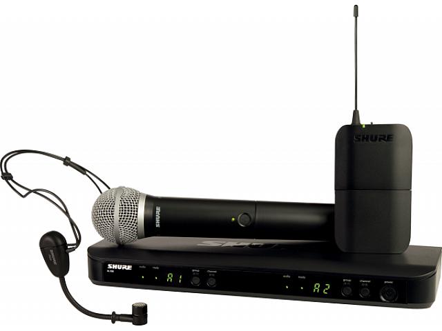 Комплект: двухканальный приемник BLX88, нательный передатчик BLX1, наголовной микрофон PGA31, ручной микрофон PG58 с передатчком BLX2, блок питания, 4 AA батарейки, инструкция.