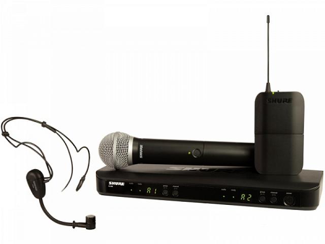 Комплект: двоканальный приемник BLX88, нательный передатчик BLX1, наголовной микрофон PG30, ручной микрофон PG58 с передатчком BLX2, блок питания, 4 AA батарейки, инструкция.