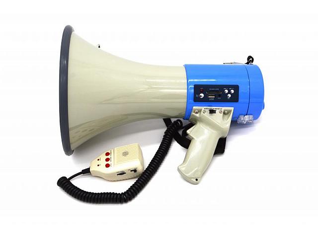 SKY SOUND MB-50 ручной наплечный мегафон с выносным микрофоном и USB/SD MP3 плеером. Модель имеет встроенную сирену, функцию записи, большую дальность слышимости (400 метров) и привлекательный дизайн. Удобно расположены регулятор громкости и переключатели.