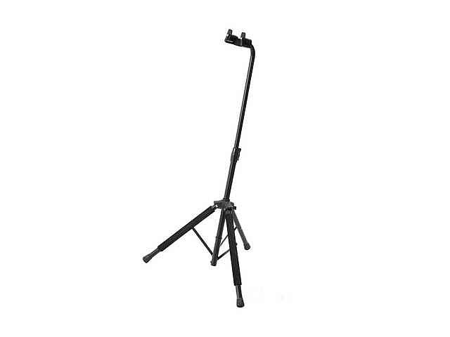 Такой вариант стойки для одной гитары не только надежно фиксирует инструмент, но и позволяет ставить его на стойку всего одной рукой. Механизм с запирающимся держателем изготовлен из прочного пластика. Регулируемая высота позволяет использовать стойку для гитары любого размера, а ножки с мягкой обивкой надежно поддерживают деку.
