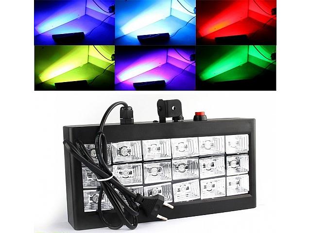 "Led Стробоскоп . Потребляемая мощность 25W Количество диодов: 18*1W Управление; Авто режим, звуковая активация, колорченджер, диммер. Вес: 1.4кг Размеры: 270*170*80mm"
