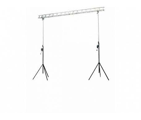 комплект: 2 х стальная ферма (треугольник основание 150мм, длинна 2м) 2 х стойки (3 ноги, лебедка, высота до 3м), 2 х Т-образный переходник для установки фермы на стойку, макс нагрузка 125 кг