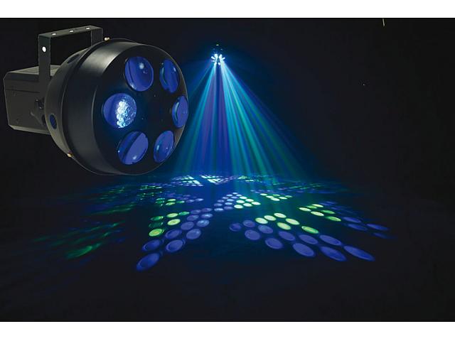 дискотечный светодиодный светоприбор, эффект Moonflower, 224 светодиода, 6 линз-светоизлучателей, широкие яркие четкие лучи, управление: активация встроенных программ звуком, DMX