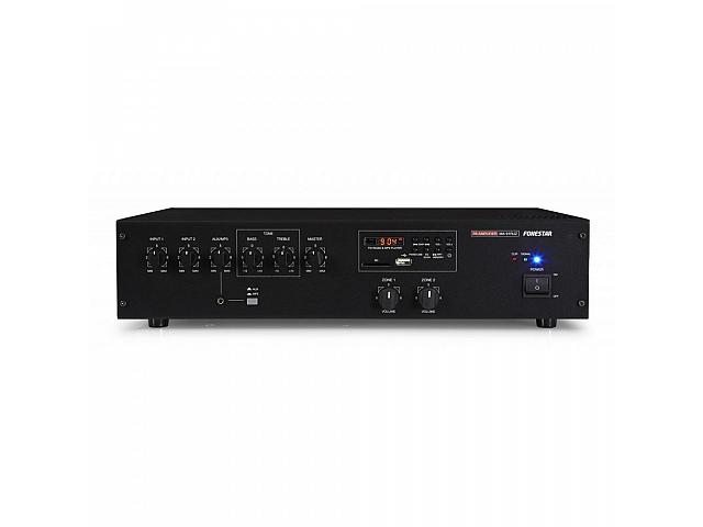 Двухзонный усилитель для систем оповещения с независимым контролем громкости и функцией пейджинга. USB/SD/MP3-плеер и FM-радио (антенна в комплекте). Фантомное питание, мощность – 90 Вт RMS.