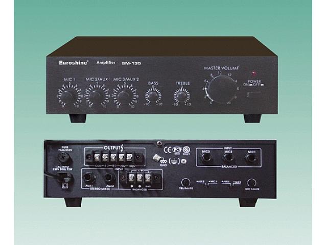 трансляционный компактный усилитель мощности, 35 Вт, частота 150 Гц- 15 кГц, 3 микрофонных входа, 2 aux, выходы - 70