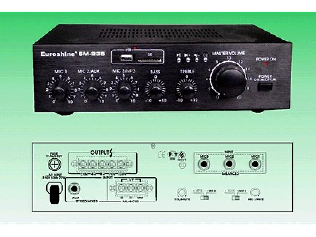 трансляционный компактный усилитель, мощность 35 Вт, частота 150 Гц- 15 кГц, 3 микрофонных входа, 2 aux