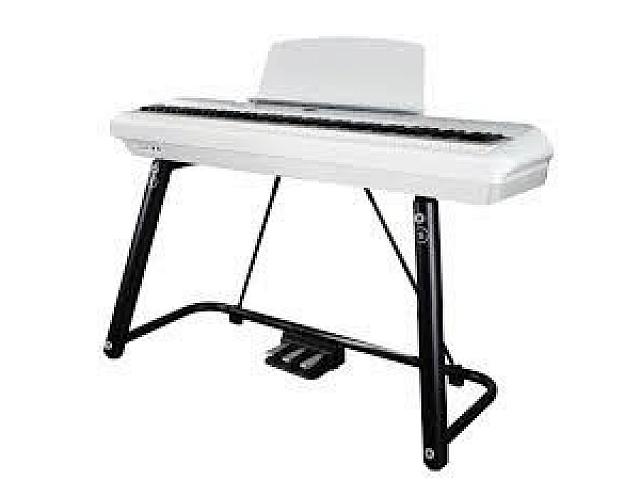 Компактное цифровое фортепиано белого цвета. В комплекте дизайнерская U-образная стойка с блоком педалей. Три педали. Функции педалей соответствуют функциям педалей акустического рояля: приглушение (soft), удержание (sostenuto), демпферная (sustain).