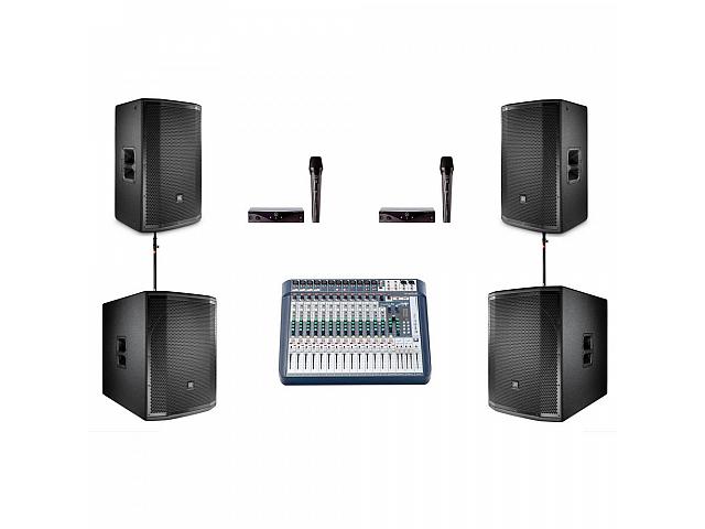 Звуковий комплект JBL PRX 815 Gold передбачений для навчальних аудиторій середнього розміру, конференц-залів, концертних майданчиків, івентів, живих виступів на сцені ресторанів та кафе, для ді-джеїв та корпоративів до 300 осіб. Комплект звукового обладнання складається з акустичної системи JBL PRX 815W (2 шт.), сабвуфера JBL PRX 818 XLF (2 шт.), мікшерного пульта Soundcraft Signature 16 та двох радіосистем AKG WMS45 Vocal.
