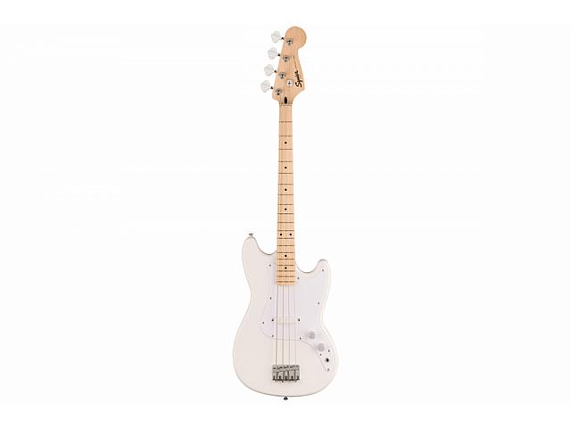 Squier by Fender Sonic Bronco Bass White – 4-струнний короткомензурний бас, форма – Bronco Bass, корпус – тополя, гриф – клен з кленовою накладкою, профіль грифа – “C” Shape, радіус накладки – 9.5" (241 мм), мензура – 30" (762 мм), кількість ладів – 19 (Narrow Tall), звукознімач (S) – Ceramic Single-Coil у нековій позиції, електроніка – Master Volume, Master Tone, бридж – стандартний 4-сідельний, колір – білий.