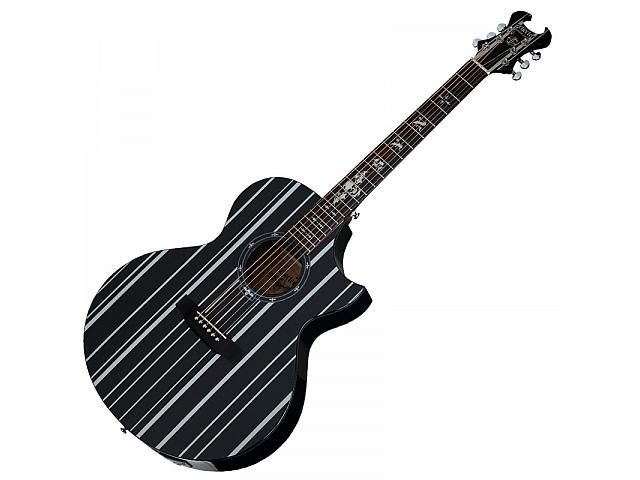 SCHECTER SYNYSTER GATES 'SYN AC GA SC' ACOUSTIC BLK - акустична гітара з п'езозвукознімач, матеріал верхньої деки: ялина, нижня дека і обичайки: червоне дерево, матеріал грифа: червоне дерево, накладка грифа: палісандр, колір: блискучий чорний з срібними смугами.