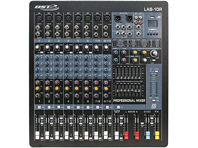 Мікшерний пульт LAB10R з дуже низьким рівнем шуму для музикантів, груп, клубів, конференц-залів. Можливість установки в 19 "рекову стійку, вбудований MP3 плеєр, полозкові фейдера.