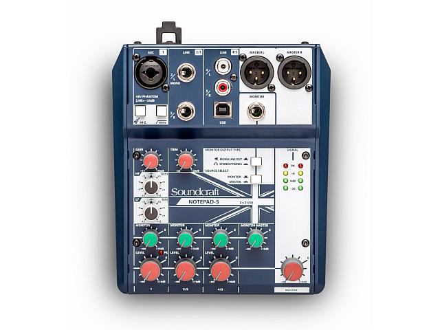 Soundcraft Notepad-5 - 5-канальний аналоговий мікшерний пульт з 1 мікрофонним підсилювачем, прямим входом, фантомним харчуванням, 2 лінійними стерео каналами і підключенням по USB.