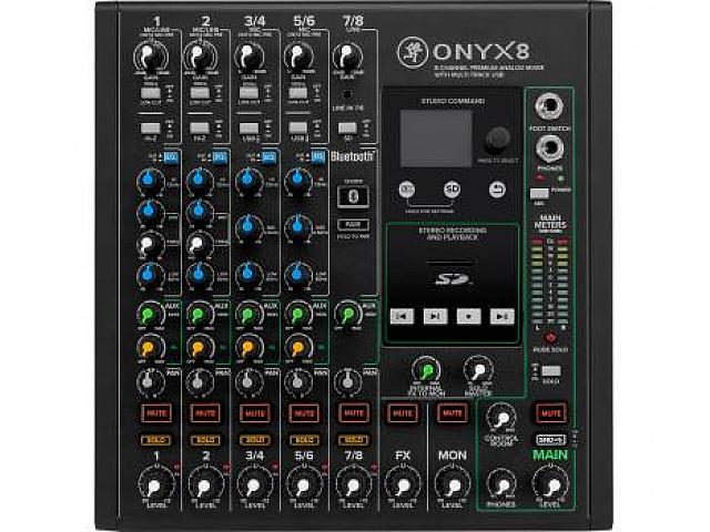 Основні особливості мікшерного пульта MACKIE ONYX8: Ультрачисте звучання, низький рівень шуму; Мікрофонні попередні підсилювачі Onyx з великим запасом хедрума та гейну до 60 дБ; Повноцінний багатоканальний запис через USB у якості до 24-біт/96 кГц; Записуйте стереомікс безпосередньо на SD-карту, а також відтворюйте музичні файли; Професійні, настроювані ефекти; Onyx Studio Command — повноколірний дисплей спрощує керування блоком ефектів і SD-картою; Еквалайзер Perkins British Style надає класичні звуки 60-х і 70-х з сучасними якістю і точністю; Стрімінг музики безпосередньо на канал через Bluetooth.