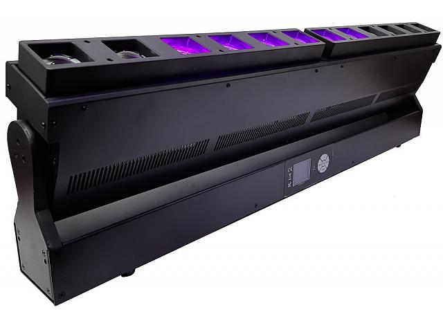 Світлодіодна динамічна планка. 12 світлодіодів по 40Вт 4-в-1 RGBW. Рух по Tilt 220 °. Двосекційний зум 5-35 °. Вбудовані динамічні макроси. Попіксельно управління. 20/57 каналів DMX. Розмір 1020х107х266 мм. Вага 15 кг.