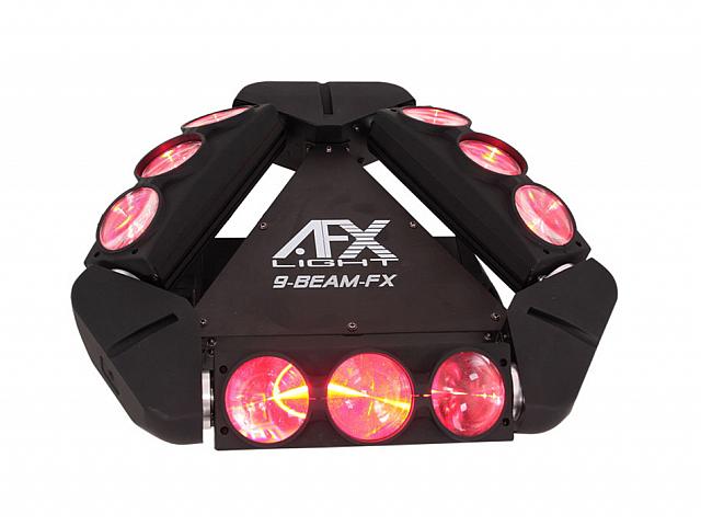 AFX 9BEAM-FX - світловий прилад з динамічним світловим ефектом і повним обертанням бази і поворотними планками з діодами, має 9 RGBW светодіоідов по 12 Вт кожен. Режими роботи: авто, музичний (вбудований програми), DMX, Master / Slave. Для зручності управління є світодіоідний дисплей. Прилад відмінно підійде для дискотек, виступів ді-джеїв і тд.