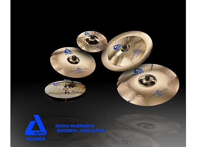 Акційний набір тарілок Boomer Set (Boomer hi hat 14 ", Boomer crash 18", Boomer ride 22 "+ Boomer splash 12" в подарунок). Серія Alpha Boomer є авторизованої серією Nicko Mc Brian'а, має поліроване покриття, логотипи в синьому кольорі, а також логотип Powerslave від Iron Maiden