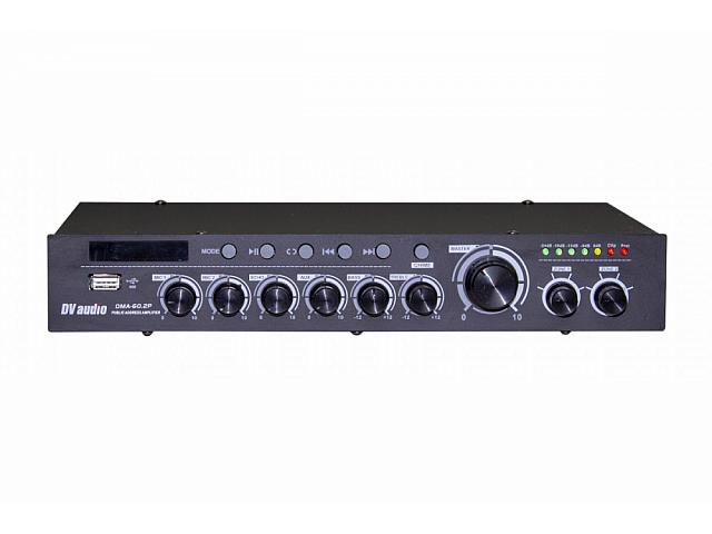 Мікшируючий підсилювач потужності DV audio DMA-60.2P з вбудованим USB-програвачем та FM-тюнером, а так само можливістю відтворення через BLUETOOTH. Застосовується в системах фонового озвучування. Оснащений двома мікрофонними входами, одним лінійним входом і лінійним виходом. Управління USB-програвачем здійснюється за допомогою кнопок stop / play, повтор, попередній трек, наступний трек з лицьової панелі підсилювача. USB-програвач підтримує USB-флешки максимальним об'ємом пам'яті до 16Гб. Управління FM-тюнером здійснюється так само з лицьової панелі підсилювача або з дистанційного пульта управління. Підсилювач виконаний в компактному корпусі висотою 1,5U для монтажу в рекову стійку не призначений.
