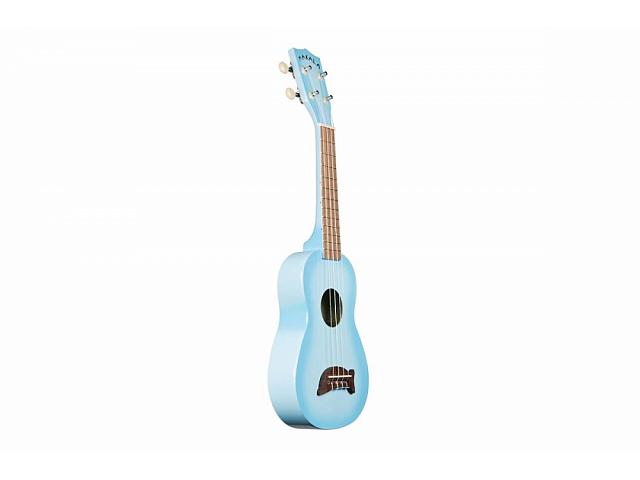 Укулеле, 4 струны, размер – сопрано, верхняя дека – махагони, нижняя дека и обечайка – композитные материалы, гриф – махагони/лаурель, цвет – голубой.